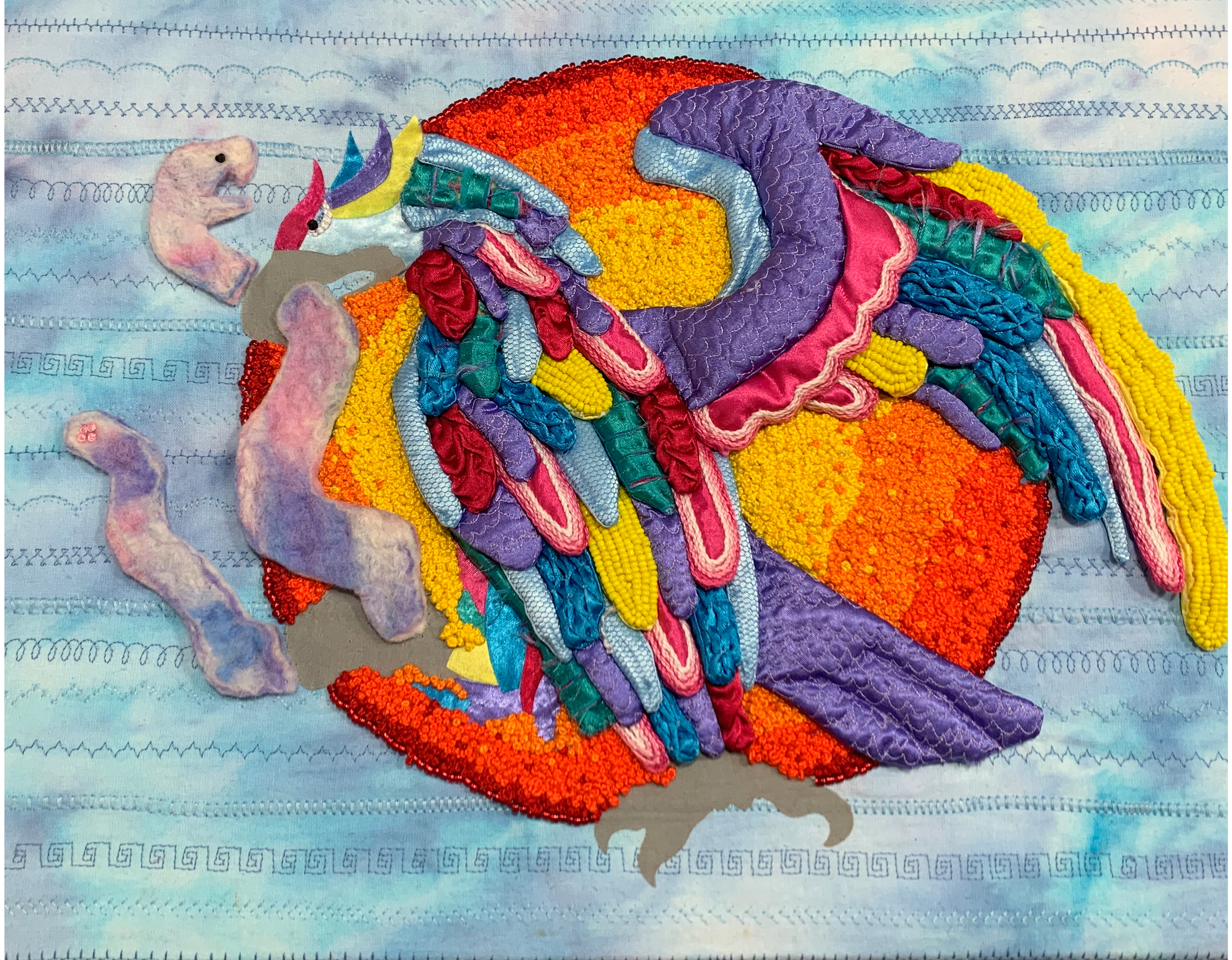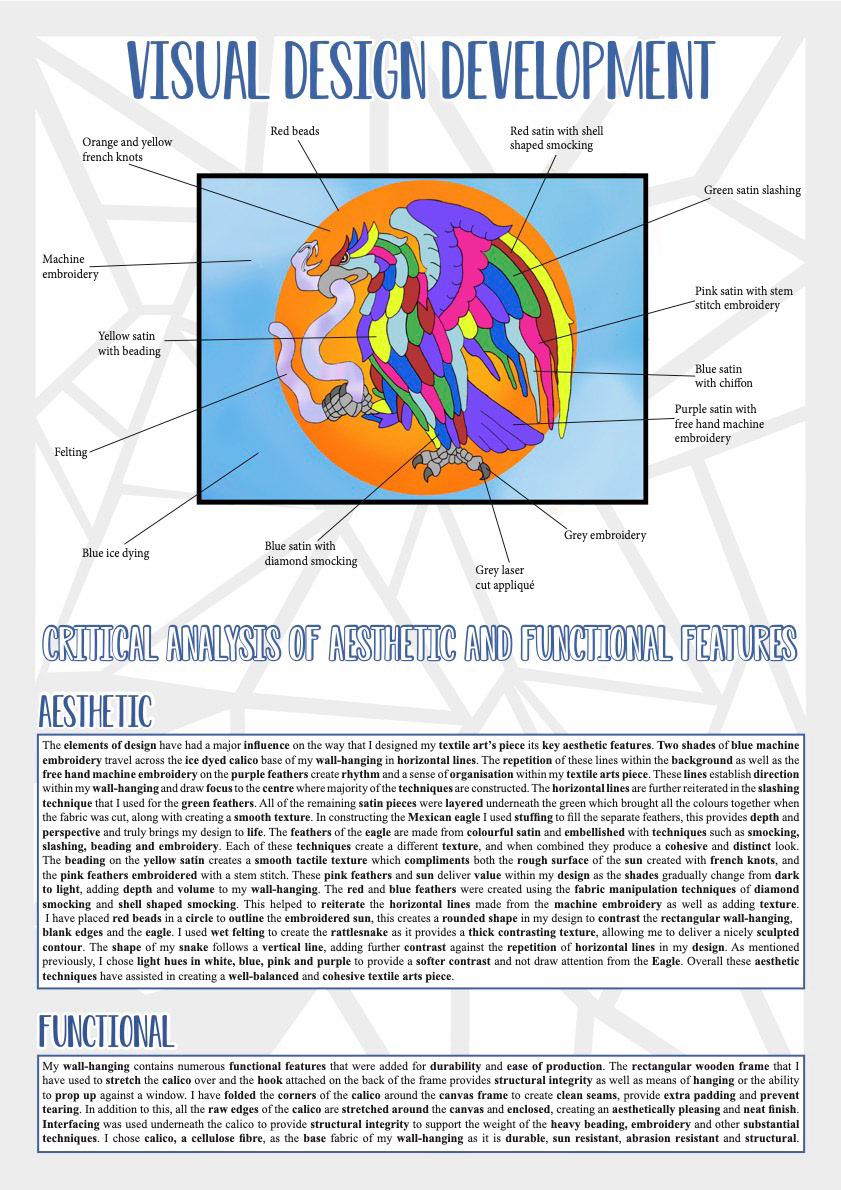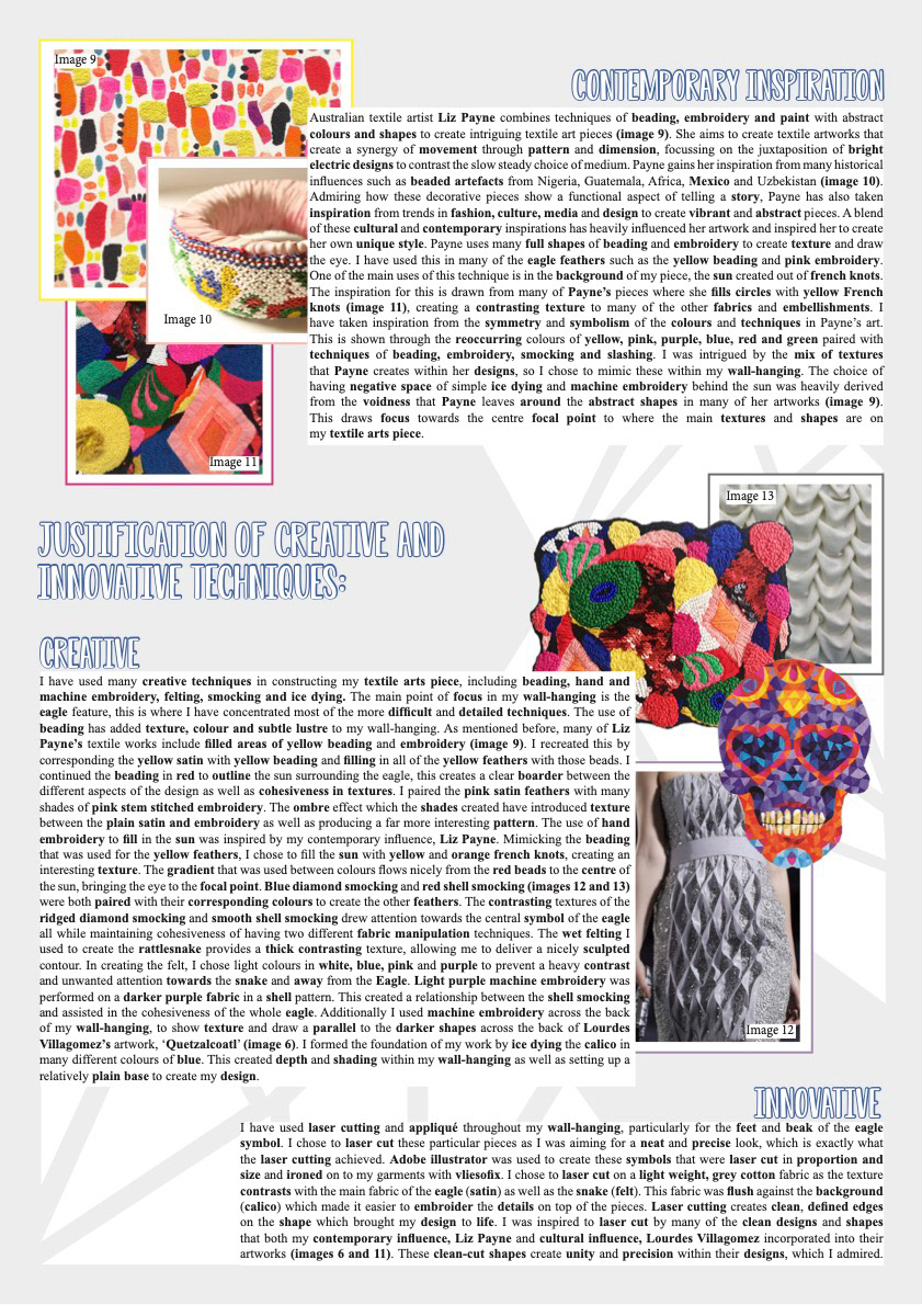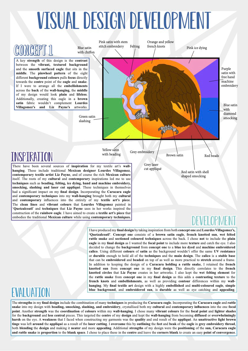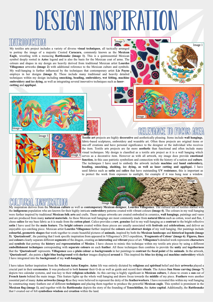 This textiles arts project includes a variety of diverse visual techniques, all tactically arranged to portray the image of a majestic Crested Caracara, commonly known as the Mexican Eagle, wrestling with a menacing Rattlesnake. This is a quintessential Mexican symbol deeply rooted in Aztec legend and is also the basis for the Mexican coat of arms. The colours and shapes in my design are heavily derived from traditional Mexican artist Lourdes Villagomez artworks with additional reference to the Mexican culture and symbols. My wall-hanging is further influenced by the techniques that contemporary artist Liz Payne employs in her designs. These include many traditional and heavily detailed techniques within my design including smocking, beading, embroidery, wet felting, machine embroidery and ice dying, as well as integrating several innovative techniques such as laser-cutting and appliqué.