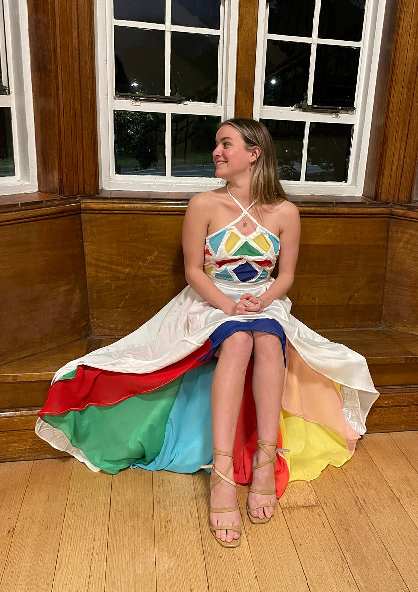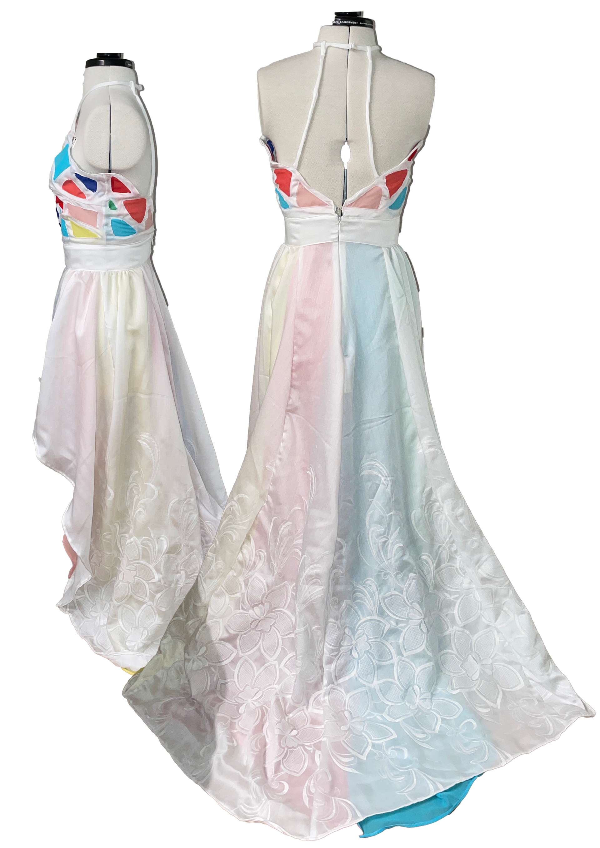 Throughout the design and production of this garment, I have subverted multiple features of a wedding dress while using the elements and principles of design create a cohesive garment. The incredible crafted stained glass that covers the Sainte-Chapelle has inspired me to produce a distinct high-low style dress comprising a variety of diverse techniques and subversions of a traditional wedding dress.
