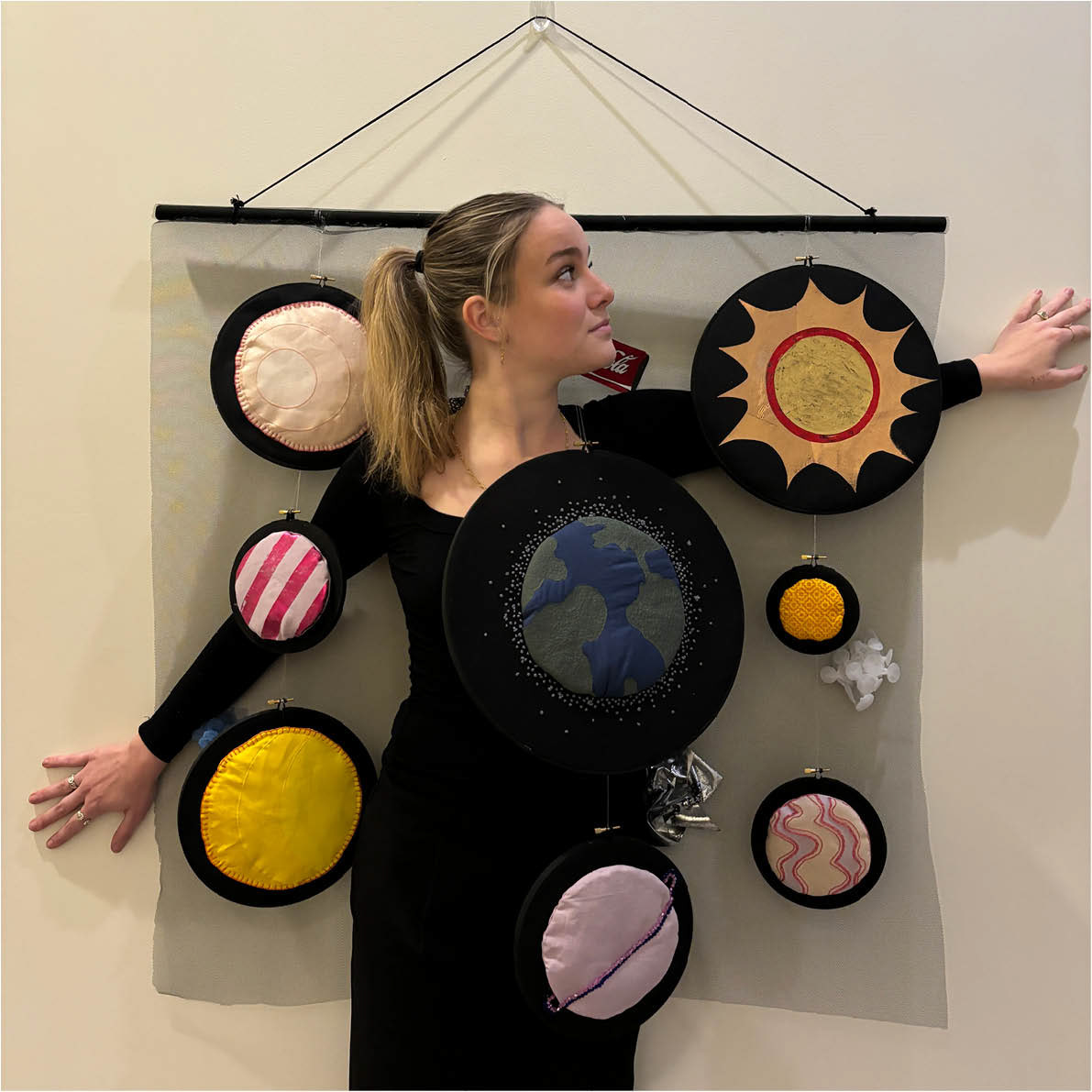 I have conveyed this concept by creating a ‘solar system’ with embroidery hoops hung from fishing wire and countless techniques to represent the planets and trash surrounding them. These techniques include naturally dying fabrics with turmeric, blueberries and beetroot, hand, machine and sashiko embroidery, beading, molas techniques, heat set thermoplastics, foiling, transfer printing and liquid latex. I have combined these techniques to create a visually striking wall hanging, conveying a message while remaining aesthetically pleasing. I have hung these embroidery hoops over a piece of black tulle in which the ‘trash’ has been adhered to. This allows for movement within my piece, creating visual depth and contrasting against the bright colours. In conclusion, the dynamic interaction of these elements symbolise the ongoing battle of anthropogenic impacts on our universe.